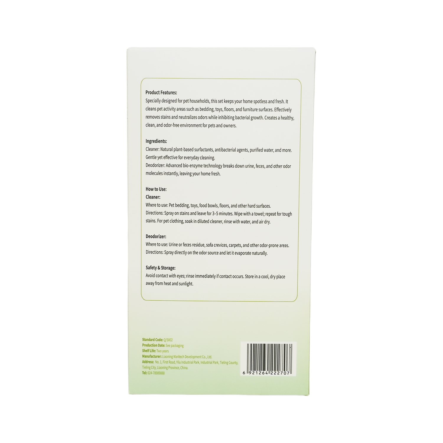 本套装专为宠物家庭设计,用于清洁宠物活动区域(如窝垫、玩具、地板、家具表面等),有效去除污渍、异味,同时抑制细菌滋生,为宠物和主人营造健康、清新的生活环境。