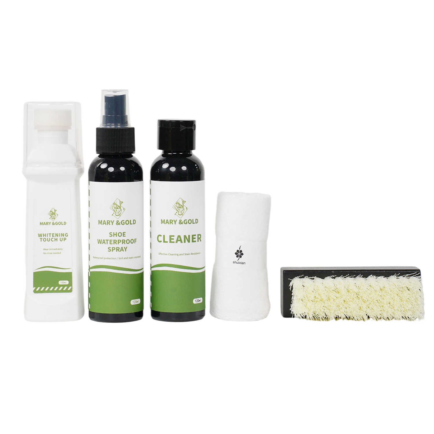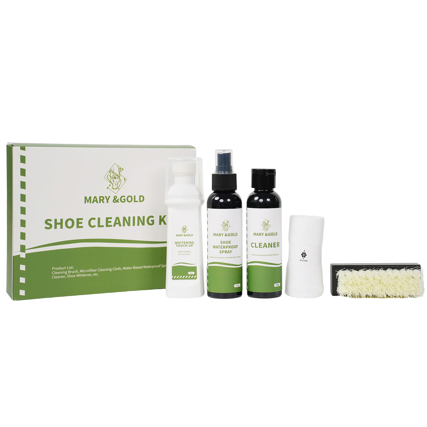 使用方法:1.先将刷子浸入温水中,再往刷子中滴加入清洁剂,之后刷洗需要清洁的部位,最后用超细纤维布擦拭并置于通风处阴干,避免暴晒或烘烤。2.确保鞋子完全干燥后,摇匀防水喷雾剂,距鞋20cm左右均匀喷洒鞋面,通风干燥处晾干(最好是恒温干燥箱),12小时形成防护膜即可以防水3.对于鞋边发黄或脏污去除不掉的部位,用布擦干鞋边并确保无水渍,按压增白剂上的小红杆,使料液流出,涂抹发黄部位,静置30分钟自然风干(勿暴晒)