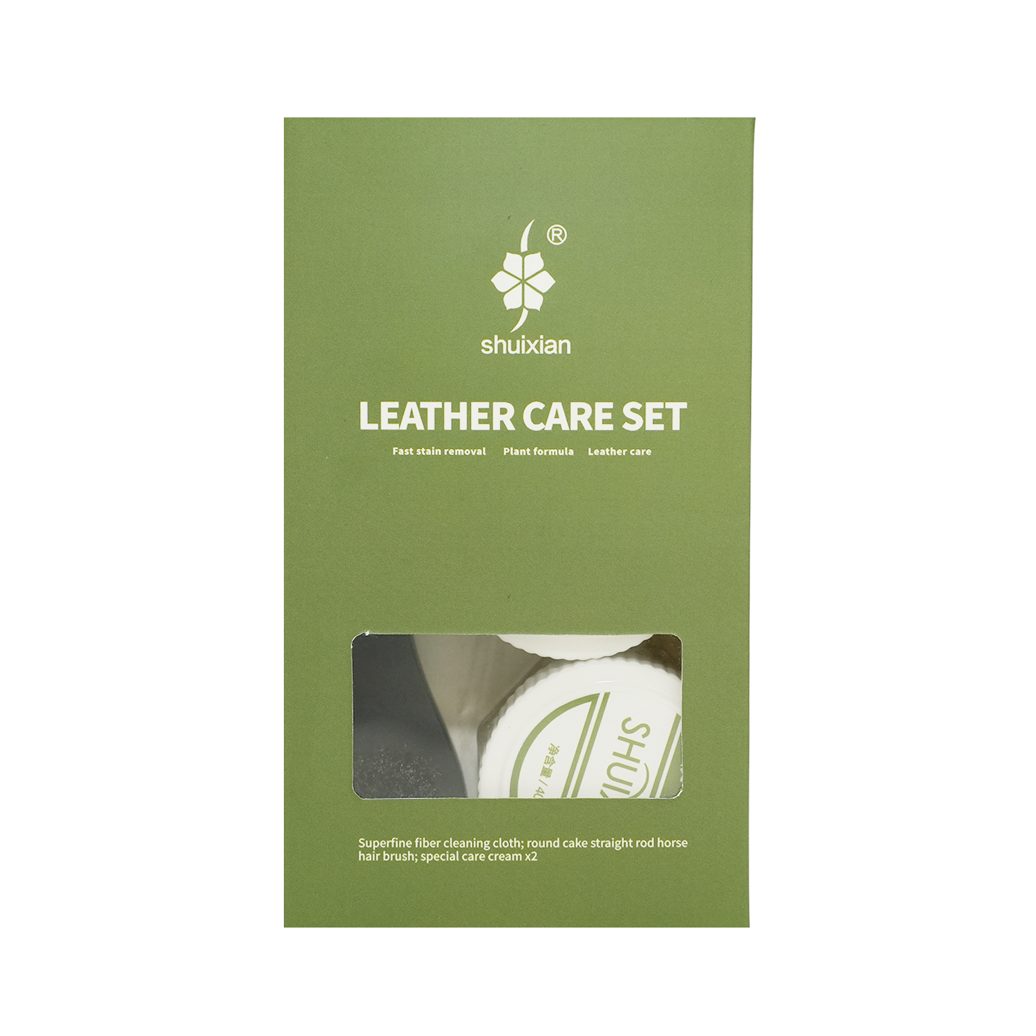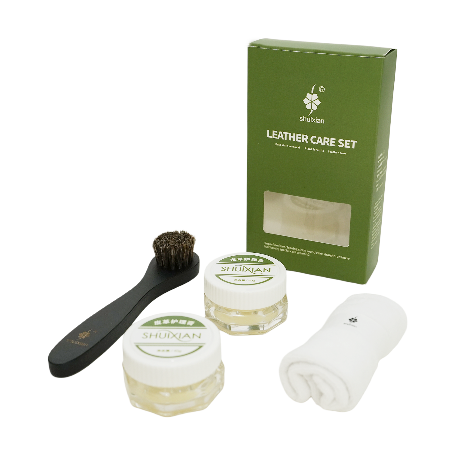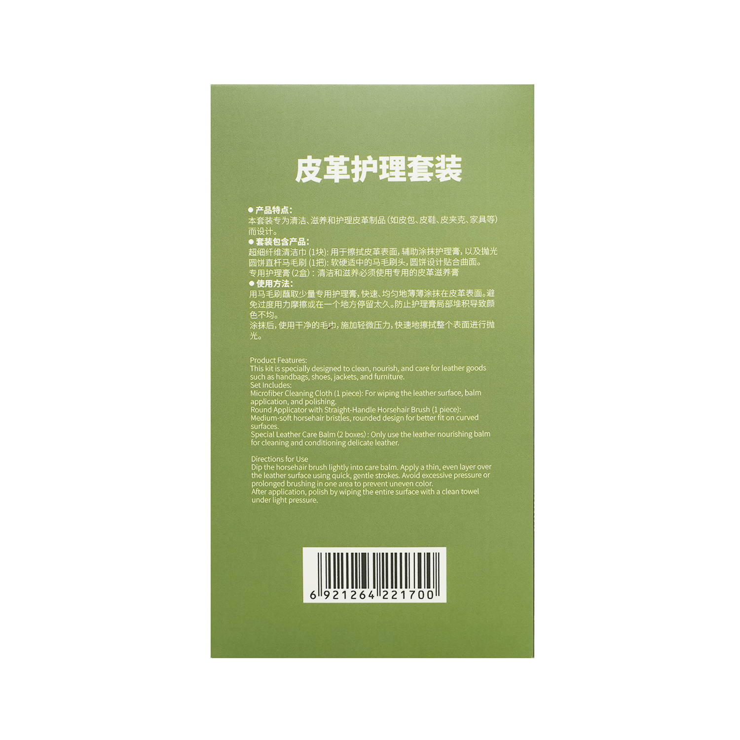 产品特点:本套装专为清洁、滋养和护理皮革制品(如皮包、皮鞋、皮夹克、家具等)而设计。使用方法:用海绵擦沿着皮革纹理方向,轻轻拂拭整个表面。动作要轻柔,目的是移除松散的灰尘和碎屑。