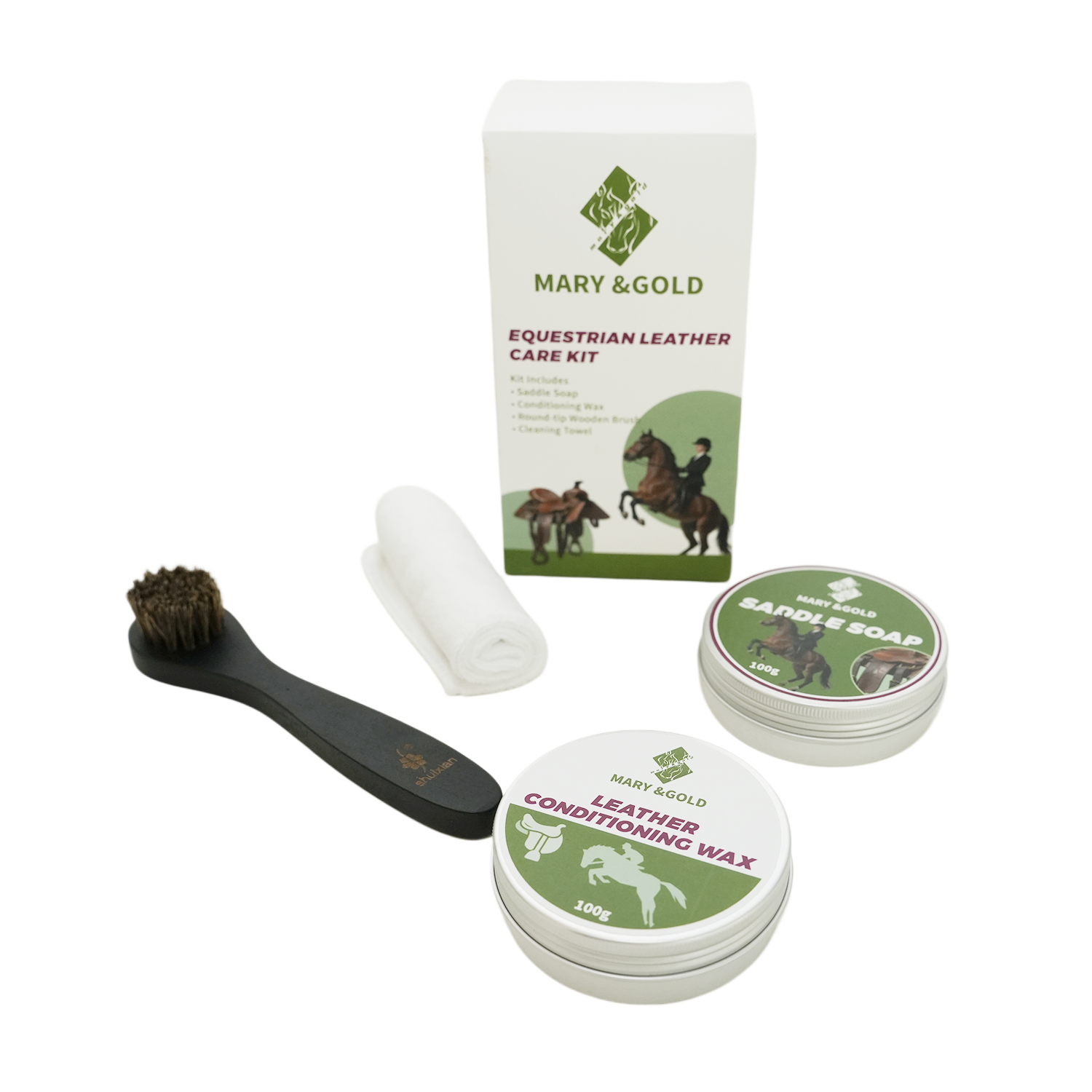 套装内容:马鞍皂,护理油,圆头木柄刷,毛巾