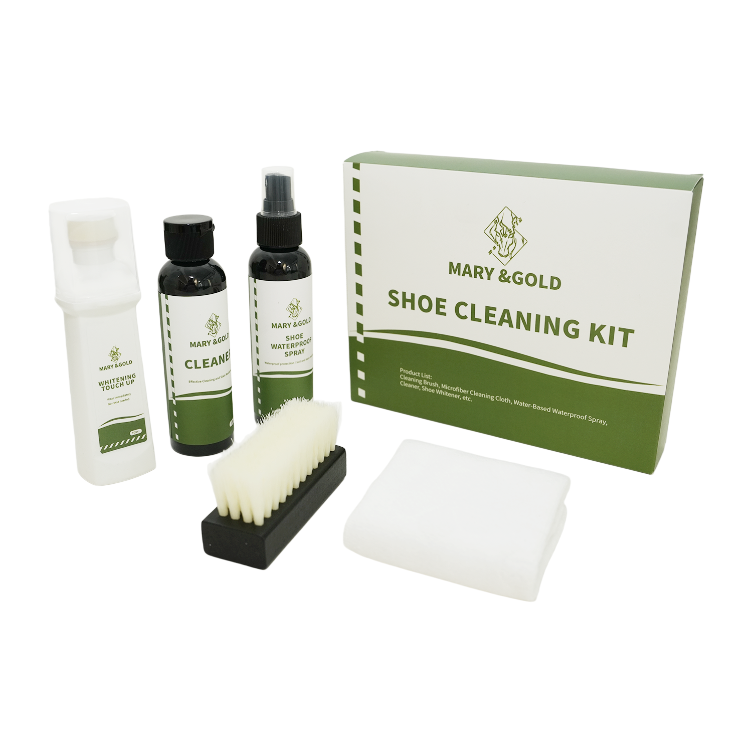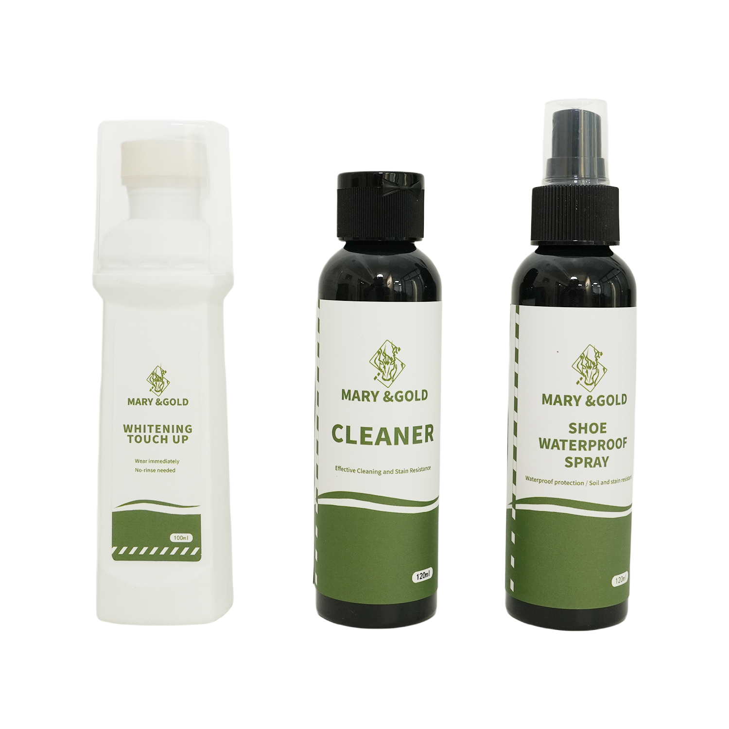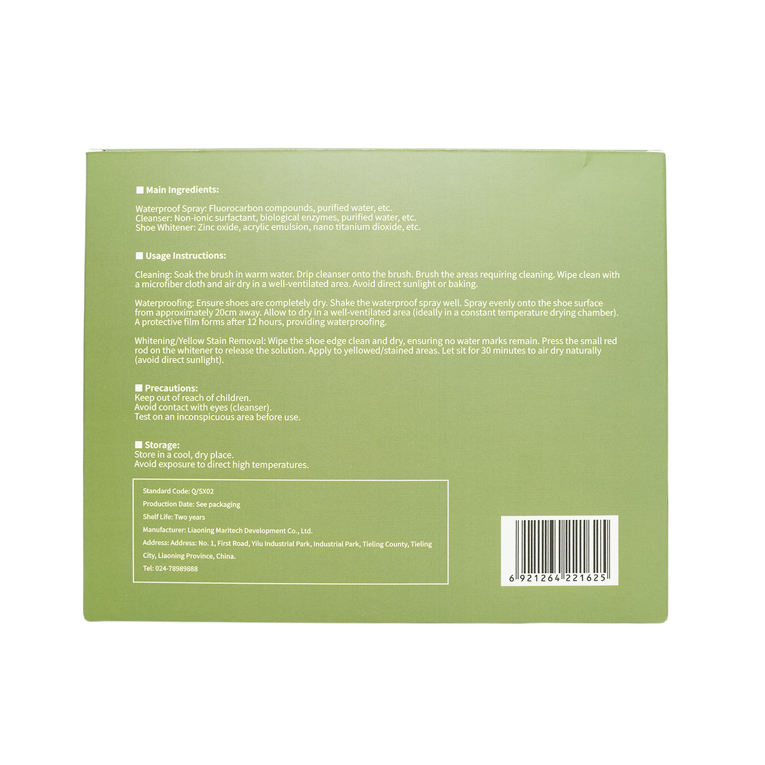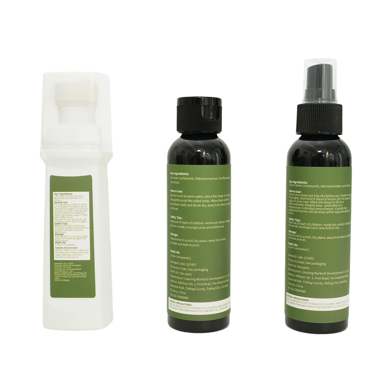 使用方法:1.先将刷子浸入温水中,再往刷子中滴加入清洁剂,之后刷洗需要清洁的部位,最后用超细纤维布擦拭并置于通风处阴干,避免暴晒或烘烤。2.确保鞋子完全干燥后,摇匀防水喷雾剂,距鞋20cm左右均匀喷洒鞋面,通风干燥处晾干(最好是恒温干燥箱),12小时形成防护膜即可以防水3.对于鞋边发黄或脏污去除不掉的部位,用布擦干鞋边并确保无水渍,按压增白剂上的小红杆,使料液流出,涂抹发黄部位,静置30分钟自然风干(勿暴晒)